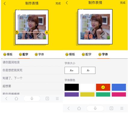 其实,不止是《欢乐颂2》的表情包,搜狗表情搜索会结合当下最热门事件、网络热词及各大节日实时更新、推荐表情包,特设“影视综艺”、“二次元”、“卡通形象”等多个类别供用户选择,随时满足聊天中各种表达需求。值得一提的是,搜狗表情搜索支持“表情制作”功能,让你轻松DIY独一无二的表情包。只需点击悬浮在首页页面右下角“+”,即可进入文字表情制作页面,上传照片作为模板,在文本框中输入符合情景的配字,调节好字体与颜色,表情即可制作完成。如果对设计表情包没想法?没关系,“表情制作”功能内置的热门模版和热门流行语可以助你无门槛DIY趣味表情包。