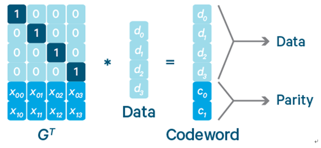 EC编码全称是Erasure Coding纠删码,是一种数据保护技术,最早应用于通信行业的数据传输的数据恢复中,同时也用于RAID-5和RAID-6存储阵列技术中。EC编码主要是利用算法对原始数据块进行编码得到校验块,并将原始数据块和校验块都存储起来。当原始数据块丢失时,通过其他原始数据块以及校验块能重新计算出丢失的数据块;当校验块丢失时,重新计算即可得到校验块。这样就能对丢失的数据进行恢复,从而达到容错的目的。对于k个原始数据块和m个校验块,算法能保证在丢失任意m个块后,都可以通过算法恢复出原来的k个原始数据块。如图3所示,一个生成矩阵GT乘以k个原始数据块组成的向量,可以得到由k个原始数据块和m个校验块组成的向量。