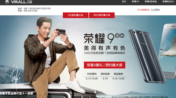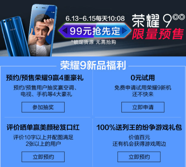 作为荣耀9的首发主阵地,华为商城预约可专享9重礼,预约地址(PC: <https://mm.vmall.com/ry9.html> WAP: <https://mt.vmall.com/ry9.html>)。6月13日,华为商城开启0元预约赢旗舰新机、99元预约赢旗舰新机、点评有礼以及购机赢荣耀畅玩平板2活动,消费者快人一步预约,即可享受专属好礼。