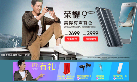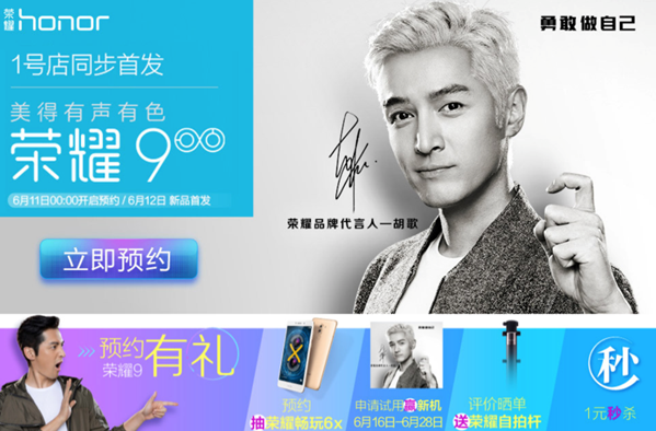 在此次荣耀年度旗舰荣耀9的预约期,荣耀还联手1号店平台(<http://honor.yhd.com/?tp=15.75160034.0.0.0.LmTq0eH-10-BFfON&ti=X5K3ki> ),预约荣耀9即可抽取荣耀畅玩6X手机一部,6月16日-6月28日期间可申请试用赢荣耀9,成功购买并晒单评价即送荣耀自拍杆,活动期间更有1元秒杀活动。