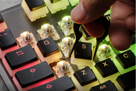 随机同样配备了一个拔键器,方便用户自己动手更换键帽,更换后的RGB键盘,灯光效果大大增强,对于喜欢酷炫的玩家,绝对是不二之选。