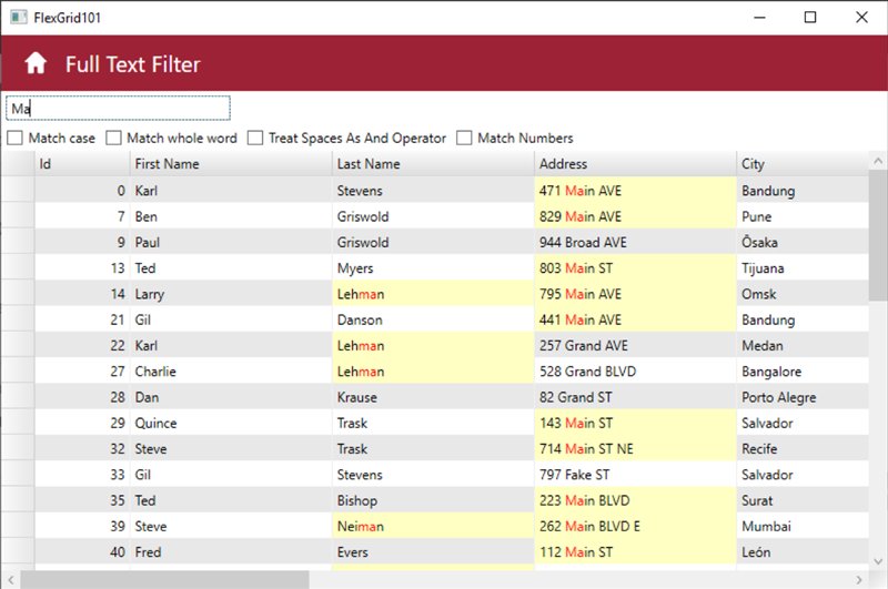全文过滤器:该控件行为与搜索框类似,允许用户突出显示FlexGrid中包含的任何匹配项,可以匹配字母大小写、整个单词、数字,甚至将空格视为“And”运算符。