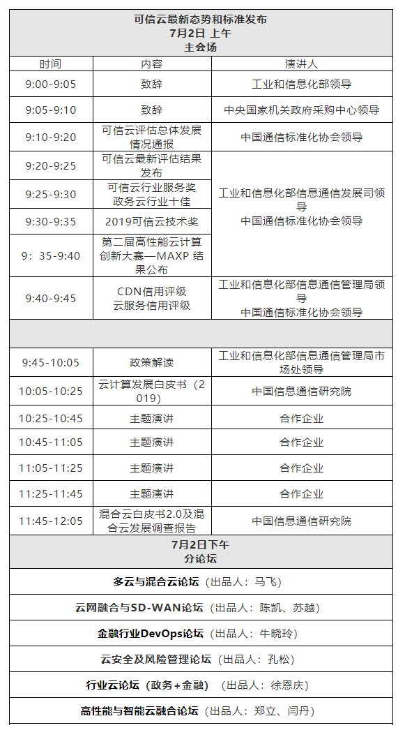 “2019可信云大会”将于7月2日-7月3日举办,详细议程如下:
