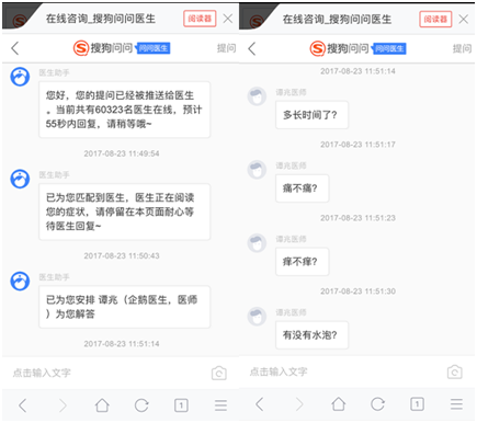 更重要的是,用户基于搜狗AI医生的判断结果,还可与优质专业医生进行在线沟通,通过线上问诊服务,得到更加专业的判断及针对性的护理建议。在搜狗AI医生判断结果页面中,用户点击“我们聘请的国内知名专家也对您的宝宝做出了建议,是否查看”提示下面的“开始对话”,医生助手即可针对性匹配、安排医生为用户解答。医生可通过与用户围绕症状分布范围、持续时间、宝宝是否痛痒、有无既往相似病状等细节问题的详细问诊,给出再次判断。据悉,共有43万优质执业医生受邀在线,可7x24小时不间断地为用户提供专业的问答服务。