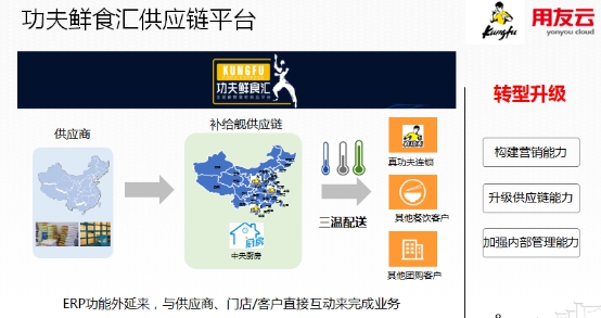 从信息化角度,功夫鲜食汇借助用友营销云,将ERP功能不断延伸,做成一个供应链平台。与供应商、门店或客户直接互动来完成业务。这种业务转型和平台化的发展带来了业务方面的能力的提升:包括升级供应链的能力,构建营销能力,加强内部管理能力。王孟杰强调,尤其是管理能力,都要依赖于这种信息技术的支持。在这种能力下,真功夫的信息化发展逐步融入移动化,云计算和大数据的方式,越来越多地走向云端。