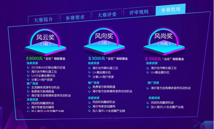 本届海尔U+创客大赛将为参赛家具企业提供包括五大优势资源支撑:“20万物联云创业基金”、“免费提供海尔U+软硬件一体物联云解决方案”、“优先接入海尔U+生态”、“国际专家指导”、“一流孵化器平台支持”,以及设风云奖1名,奖金8000美元;风向奖3名,奖金3000美元;风尚奖10名,奖金1000美元的物质奖励。成功晋级企业的智能家具、家装产品也将融入海尔U+厨房、浴室、起居、娱乐、安防等大智慧生态圈搭建的全场景智能生态系统,成为丰富家居家装子场景的有生力量。