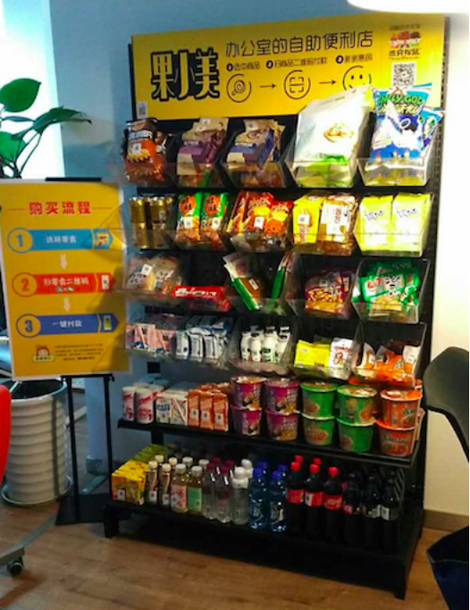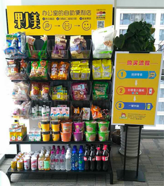 果小美“办公室自助便利店”是一种放在办公室里的开放式无人值守货架,用户扫码付款后即可取走零食,让上班族足不出户即可满足日常零食需要。“办公室自助便利货架”出现后,受到白领人群的普遍欢迎,不少企业也把这当成是提升员工幸福感和归属感的一种福利方式。