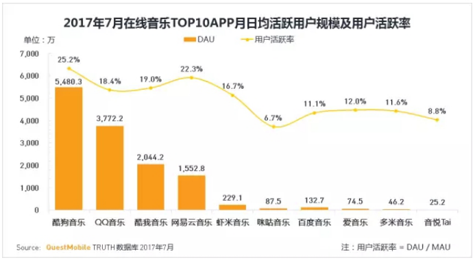 QuestMobile报告还显示,在月日均活跃用户规模及用户活跃率方面,酷狗音乐以5480.3万日均用户数排名第一,QQ音乐月日均用户数3772.2万,位列第二,酷我音乐月日均活跃用户数2044.2万,排名第三,居于第一梯队,排名第三第四的网易云音乐及虾米音乐分别为1552.8万、229.1万。在用户活跃率方面,排名前三酷狗、QQ音乐、酷我音乐的用户活跃率分别为25.2%、18.4%、19.0%。从排行榜中可以看出,在线音乐APP用户活跃率差异较大,头部应用通过内容、平台、及创新能力,极大提高了用户活跃度和粘性,用户活跃度较好。