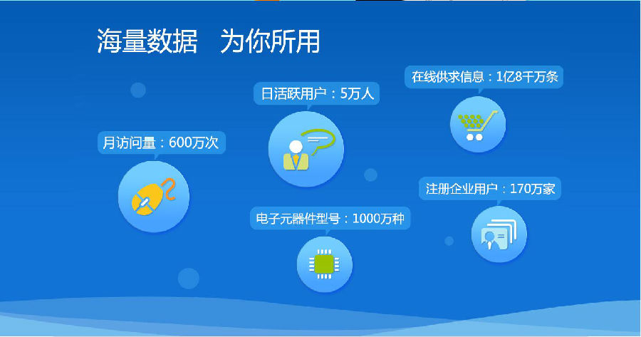 写得再好那也是外在,下面用数据给你展示一下什么叫硬实力。在这里,海量数据为你所用,月访问量600万次,日活跃用户5万人,在线供求信息1亿8千万条,注册企业用户170万家,电子元器件型号更是多达1000万种。只要你能在华强电子网pc上搜得到的IC元器件,在触屏版上也同样能够找到。