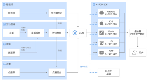 业务支持方面,腾讯云X-P2P,做到了三“全”,全平台支持、全协议格式支持、全业务场景覆盖。X-P2P全面支持 Android/iOS/OTT/Flash/HTML5 等系统平台,支持 arm/x86/mips 等架构,对各种手机、OTT 设备等都全面兼容;点播支持 mp4/flv/HLS/ts/MPEG-DASH 等文件类型,直播支持 rtmp/http-flv/HLS/udp/rtsp/MPEG-DASH 等协议;全面支持互动直播、直播、点播、短视频、文件下载等业务场景,接口简洁统一,各终端适配简单。可根据业务场景选择合适的延迟,一键下发是否启用 P2P。