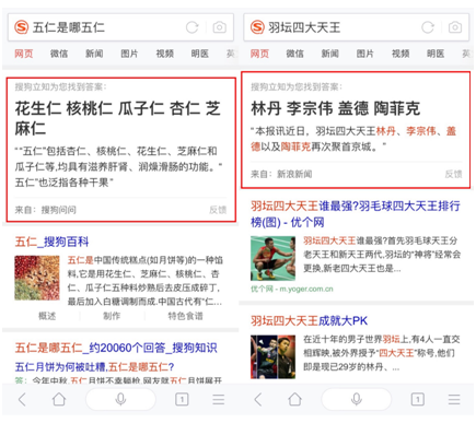 近日,搜狗“立知”又新增“多答案问题”回答功能,对于用户搜索的有多个客观短答案的问题,系统可直接精准作答。以上述的“五仁是哪五仁”为例,用户只需要在搜狗搜索移动端直接搜索这一关键词,系统立刻给出答案:花生仁、核桃仁、瓜子仁、杏仁、芝麻仁,而不是无数条相关报道或信息需要用户点开链接查找精准答案。或者搜索“羽坛四大天王”,即使不带疑问词,系统也能快速识别出用户搜索意图并返回答案:林丹、李宗伟、盖德、陶菲克。值得注意的是,搜狗立知在给出精准答案的同时,还一并提供了答案的网页来源,点击还能进一步延伸阅读。