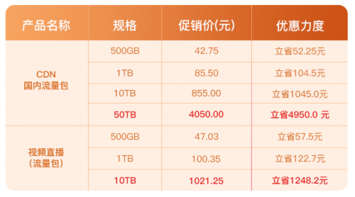 年末狂欢盛典,华为云CDN给了一个超级狠的折扣价,只需4.5折即可购买CDN和视频直播的流量包,如果你是华为云新注册的用户,就可以享受这个超低的折扣优惠,购买CDN国内流量包最高可省4950元,视频直播流量包最高可省到1248.2元,这么低的折扣优惠你还等什么,赶快来抢购吧!