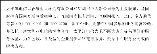 太平洋电信持有可覆盖中国大陆的IP***牌照(除新疆和西藏),支持 6 个 CoS,在全国各地39个主要城市拥有49个网络节点,其中上海本地就拥有4个,新推出的上海数据中心就是其中一个核心网络节点,支持各种主流专线接入方式,还可根据高安全性需求的客户如金融客户提供高品质链路。在跨境网络方面,通过与澳大利亚电信等国际电信运营商的深度合作,太平洋电信可提供大容量跨境专线服务,帮助企业实现全球业务数据的高速传输。