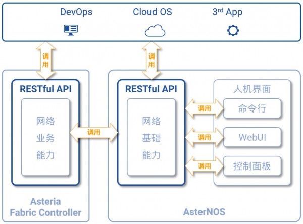 * Asteria Fabric Controller通过调用AsterNOS的RESTful API、基于网络基础能力所构建的网络业务能力也通过RESTful API开放,将原子级的网络基础能力封装为网络业务能力,为使用者屏蔽操作细节,以降低复杂度并提升效率;