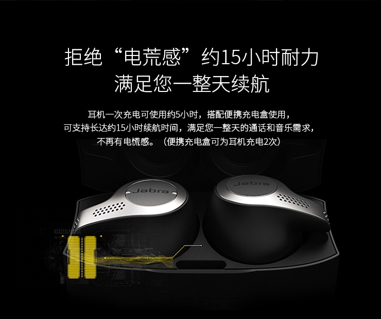 当你你正在和合作伙伴聊得正嗨,耳机突然没电,极有可能因此被对方贴上为不专业,没诚意的标签。 Elite 65t配合便携充电收纳盒套装一起使用,工作时间可长达约15小时之久,对于商务应用的人士来说,是十分实用和省心的功能,毕竟需要经常充电的耳机真的会影响用户的使用效率和体验。这个续航时间基本能够满足大部分职场人群的一天所需。