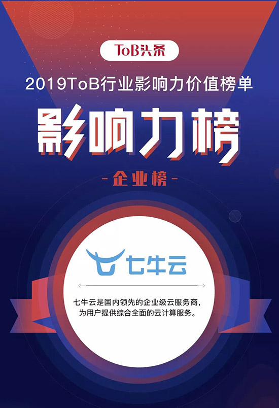 12月23日,3W产业媒体中心旗下ToB行业头条发布的“2019ToB行业影响力价值榜单·企业榜”正式揭晓。七牛云凭借创新的技术能力和领先的服务能力,入选“2019ToB行业影响力企业榜”,再获权威机构认可。