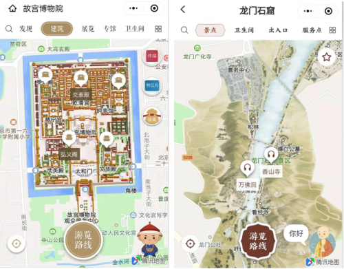智慧景区解决方案能够基于小程序提供旅游导览地图,并且针对旅游场景提供手绘地图,更好的融合景区风格,目前已与北京故宫、龙门石窟等著名景区联合打造了专属小程序,为百万级游客带来了数字化旅游体验。同时开发者可以登录腾讯位置服务官网-小程序解决方案页面了解详细信息。