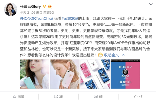 2018年开始渐变色逐渐运用到手机当中,为手机ID设计注入了新的元素,消费者也乐于看到新鲜且不一样的设计风格。说到手机颜色的运用,我们不得不再次提到荣耀。从荣耀8开始,荣耀开启了ID设计潮流之旅,魅海蓝版本的推出深受消费者欢迎,随后各大厂商纷纷效仿推出新品。到2017年荣耀9发布, 3D曲面极光后壳、个性的海鸥灰配色再度引潮流;随后荣耀10的发布,采用变色极光镀膜工艺,带来极光幻影色。荣耀一直在创新,一直在引领潮流,促进手机工业设计升级。如今,荣耀20i发布,带来了全新自然渐变色—渐变红/渐变蓝,历经8层精湛工艺打造,最终打造出光影随行的炫光效果。手机作为年轻人的潮搭,荣耀20i还联合潮牌AAPE推出荣耀20i AAPE x HONOR 特别版,一路走来,荣耀始终在引领ID设计潮流,过去是,现在是,将来还是。而联合潮牌合作推出新品的做法,或也将引发行业效仿。