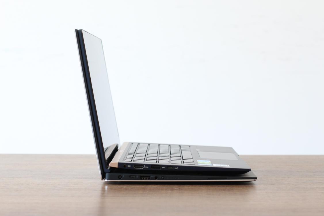 从侧面展示可以看出,华硕灵耀Deluxe13将机身有明显向上抬起。