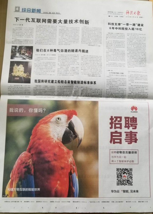 这则招聘信息是华为云在报纸和华为官网招聘网站、华为云官方微信上公布的,小编从招聘内容上看到,这份工作的岗位名称是“动物语言翻译师”,所属华为Cloud&AI产品与服务部,工作地点在深圳,更有去热带雨林工作的机会。