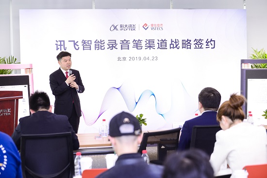 签约仪式现场,科大讯飞轮值总裁胡郁,伟仕佳杰执行董事、中国区CEO 刘宁东分别致辞。科大讯飞轮值总裁胡郁介绍了科大讯飞的战略、语音识别技术的发展。并表示“讯飞智能录音笔颠覆了传统录音笔这个领域,并且使它的应用面更加广泛,面向未来我们有更多的产品,还有专业的销售领域支持的新的解决方案,我都非常期待,非常高兴科大讯飞和伟仕佳杰能够结成战略合作伙伴。”