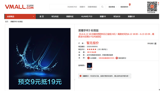 据官微发布内容了解到,6月6日10点08分-6月12日18点,用户不仅登陆Vmall商城和京东商城即可参与荣耀手环3盲约,还能享受以下特惠,其中包括:1.零元预约抽奖。荣耀手环3不仅可以零元预约,参与预约的用户,还将有机会获得荣耀送出的荣耀V9、荣耀WiFi穿墙宝、荣耀耳机等奖品之一;2. 9元订金抵扣19元。用户预交9元预约订金,实际购买荣耀手环3时可直接抵扣19元,在尾款支付阶段支付成功,将获得畅玩平板2、荣耀V9、荣耀手环3等奖品的抽奖机会。