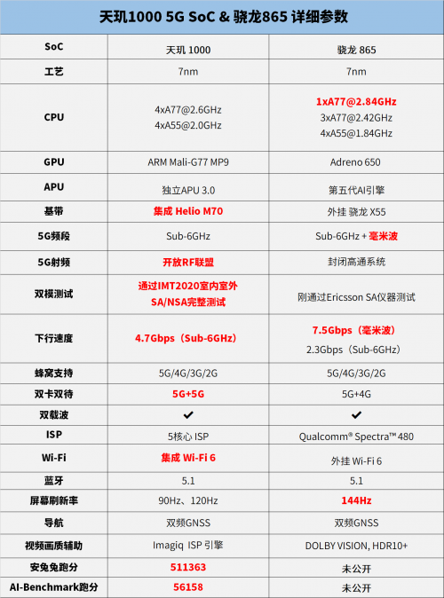 天玑 1000和骁龙 865在基带中使用不同的解决方案,骁龙865遵循上一代外挂基带的设计,在功耗和散热方面存在许多问题。例如,在今年下半年,使用骁龙855 X50解决方案的5G手机重量可以说是妥妥的重,并且电池寿命在某种程度上是不足的。