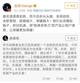 今天上午,华为消费者业务CEO@余承东在微博宣布了今年荣耀的发展目标,他提到了在未来将全力支持荣耀发展,让荣耀成为中国前二,全球前四的极具国际竞争力的手机品牌。随后,荣耀总裁@赵明转发了这条微博,并提到了将用“极具竞争力“的产品让用户满意,让荣耀更加荣耀!