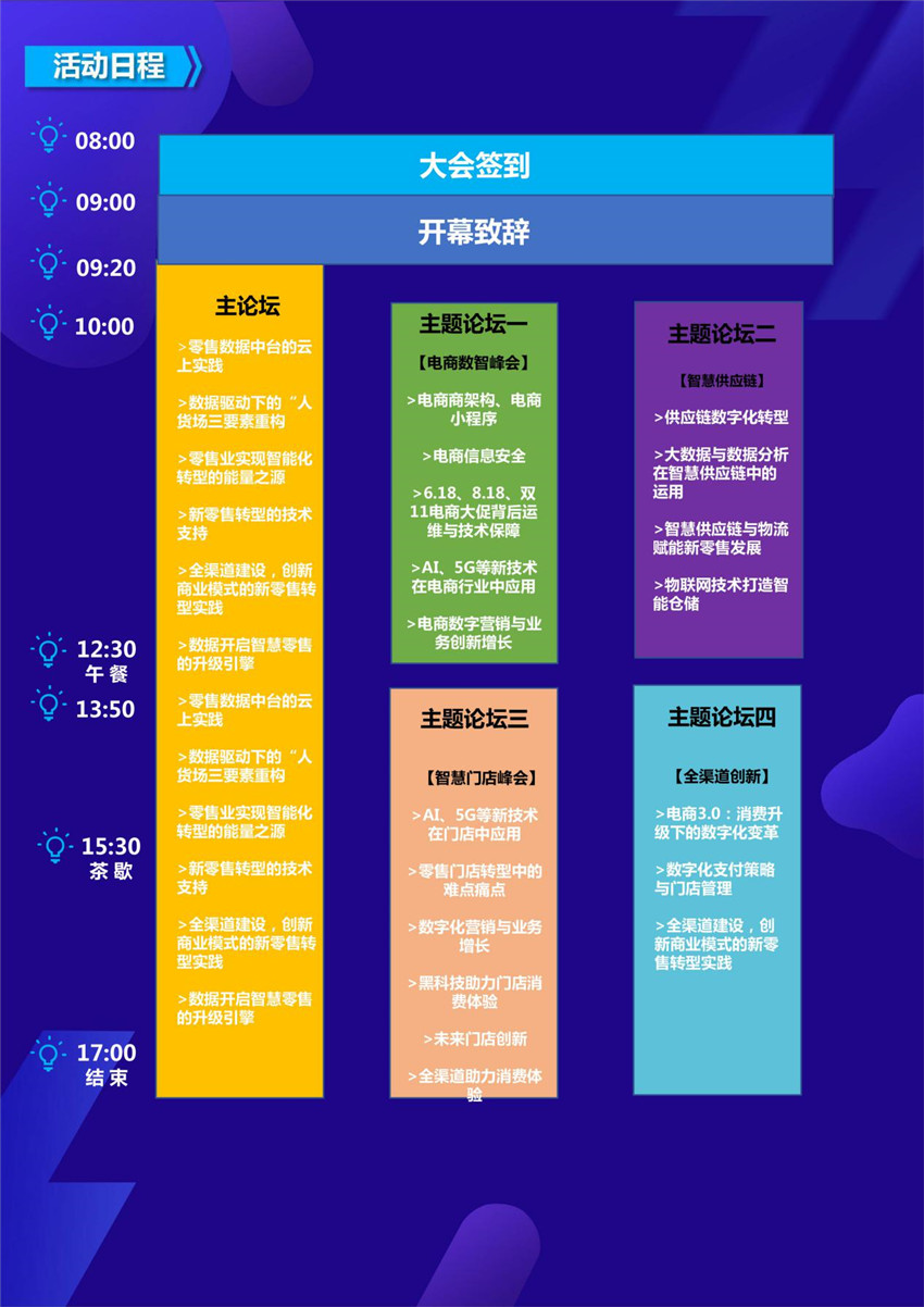 主论坛亮点:零售数据中台的云上实践、数据驱动下的“人货场”三要素重构、零售业实现智能化转型的能量之源、新零售转型的技术支持、全渠道建设,创新商业模式的新零售转型实践、数据开启智慧零售的升级引擎、零售数据中台的云上实践、数据驱动下的“人货场三要素重构、零售业实现智能化转型的能量之源、新零售转型的技术支持、全渠道建设,创新商业模式的新零售转型实践、数据开启智慧零售的升级引擎。