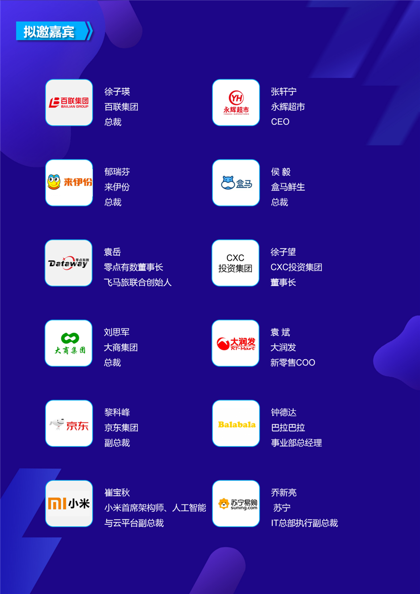 另外,峰会将分设“电商数智峰会”、“智慧供应链”、“智慧门店峰会”、“全渠道创新”四个主题分论坛。届时,峰会将邀请天猫、京东、苏宁易购、百联集团、永辉超市、盒马生鲜、小米科技、拼多多、大润发、每日优鲜、可口可乐、唯品会、汇通达、蓝月亮、寺库等行业知名品牌负责人对当前热点话题进行分享与探讨,讲述智慧场景应用,同时如何用最新技术解决新零售转型升级问题。