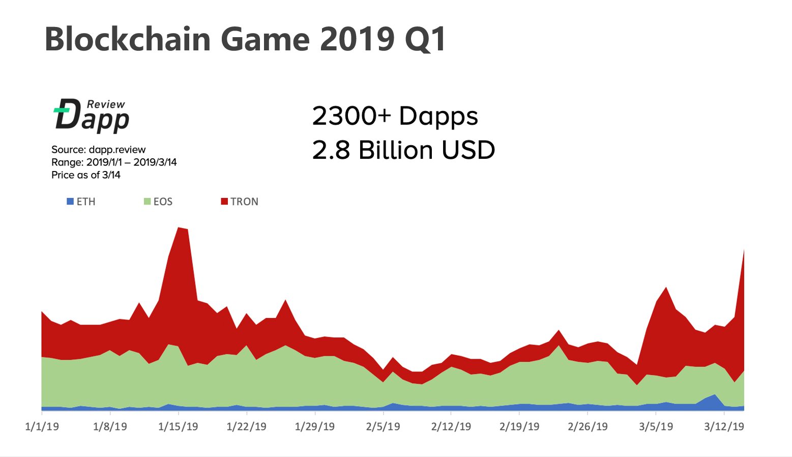 根据 DappReview 数据,2019年第一季度,市场上 DApp 数量已超2300款,3个月间 DApp 交易额达到 28亿 美金,高于2018年半年的成交额,其中由 TRON 带来的增长非常迅速。