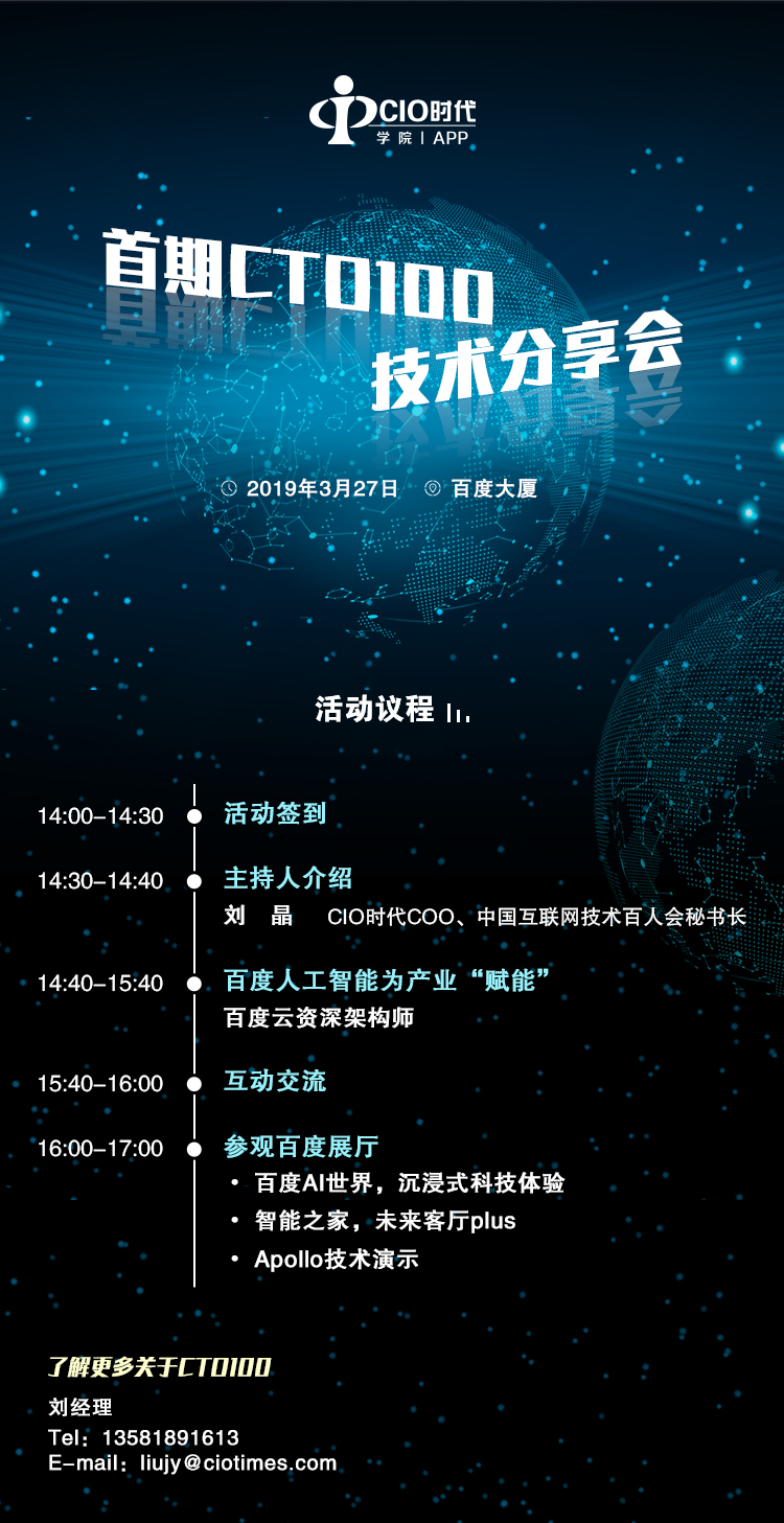 3月27日,由CIO时代学院和中国互联网技术百人会主办,CIO时代APP承办的“首期CTO100技术分享会”将带领大家走进百度,共同探索人工智能的奥秘。届时将邀请行CIO班学员以及业内知名CTO到场参加本次活动。