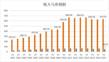 公司2017年的收入为635.25亿美元,比2016年的627.99亿上升了1.15%。公司的收入虽然巨大但是公司的利润率却并不高。2017年公司的净利润为48.57亿元,销售利润率为7.64%。2017年公司的每股收益为3.4美元。