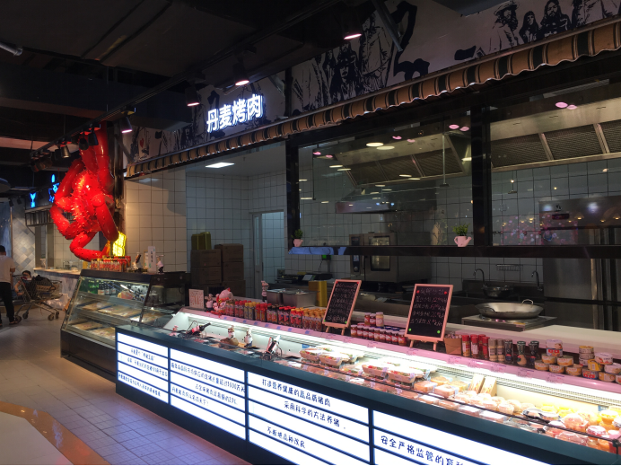 在鲸选未来店中,生鲜区和配套的餐饮区占到整个门店相当大的比重,不仅引进了波士顿龙虾、澳洲龙虾、网易未央等生鲜品类,还提供现场的烹饪和就餐服务,深度满足消费者体验,海域殿、鲸寿司、丹麦烤肉、澳牛坊、新能量等餐饮档口,都以餐吧的形态出现。每个餐饮档口都留有不小的就餐区,可以在高峰期容纳足够多的堂食人数。可以看到,体验式消费正在成为传统零售线下运营的核心。