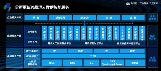 据介绍,腾讯云数据智能服务重点围绕数据科学家、应用开发者、业务管理者三大群体,以用户为本、以产业数字化转型和智能化升级为目标,致力于提供全面丰富、高性价比的各种数据智能工具,并和合作伙伴一起,为客户打造具备真正商业价值的整体解决方案。在数据基础能力层,腾讯云依托大数据平台、机器学习平台、数据仓库等,打造面向数据科学家的高效工具矩阵;在应用服务层,腾讯云通过应用平台和应用服务降低AI落地门槛,让应用开发者灵活便捷的接入AI能力;在行业解决方案层面,腾讯云和合作伙伴一起,实现零售、泛互联网、泛政府、企业和金融等众多领域的方案落地。