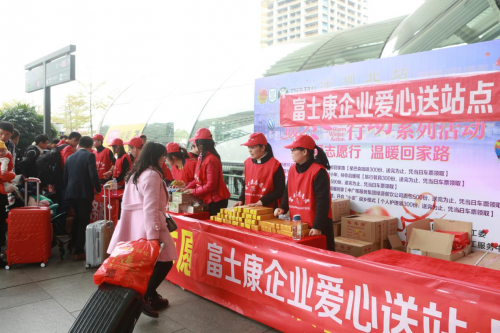 随着对员工关怀的进一步完善,在今天富士康为员工所做的不仅只是提供出行专列,还提供许多配套设施。比如在2019年春运期间,富士康龙华园区还联合深圳北站,在东广场设置服务点,为员工提供热饮、乘车臂章及乘车指引。深圳北站还专门为富士康员工开通了绿色通道,贴有“暖冬行动”臂章的富士康员工在安检及乘车环节均可快速办理,让富士康员工们的“回家”变得更轻松一点。