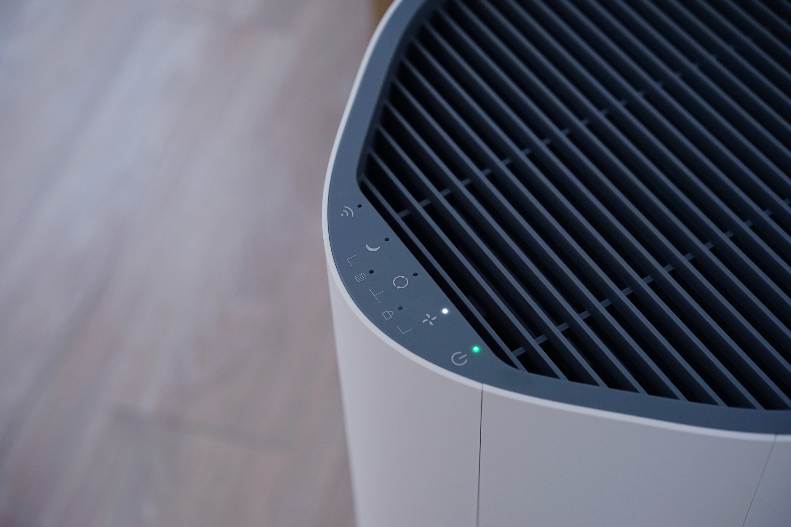 机身顶部,我们能看到出风口和全部按键,Wi-Fi键、睡眠模式、自动模式、风力调节和开机按键均分布在此,电容式触摸设计使得其看起来并不会拥挤或突兀。