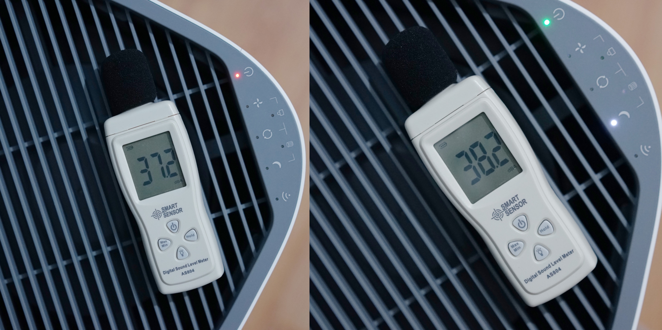 大家都知道,很多空气净化器开启后声音非常大,平时听着都闹心,更别提伴着这声音睡觉了,但720全效空气净化器C400的睡眠模式噪音却控制的十分优秀。笔者实际测试:不开启空气净化器时,屋内噪音为37.2dB;开启净化器睡眠模式,数据显示为38.2dB,几乎没有什么噪音产生,效果给力。笔者平时开启睡眠模式睡觉,丝毫不会受其影响。