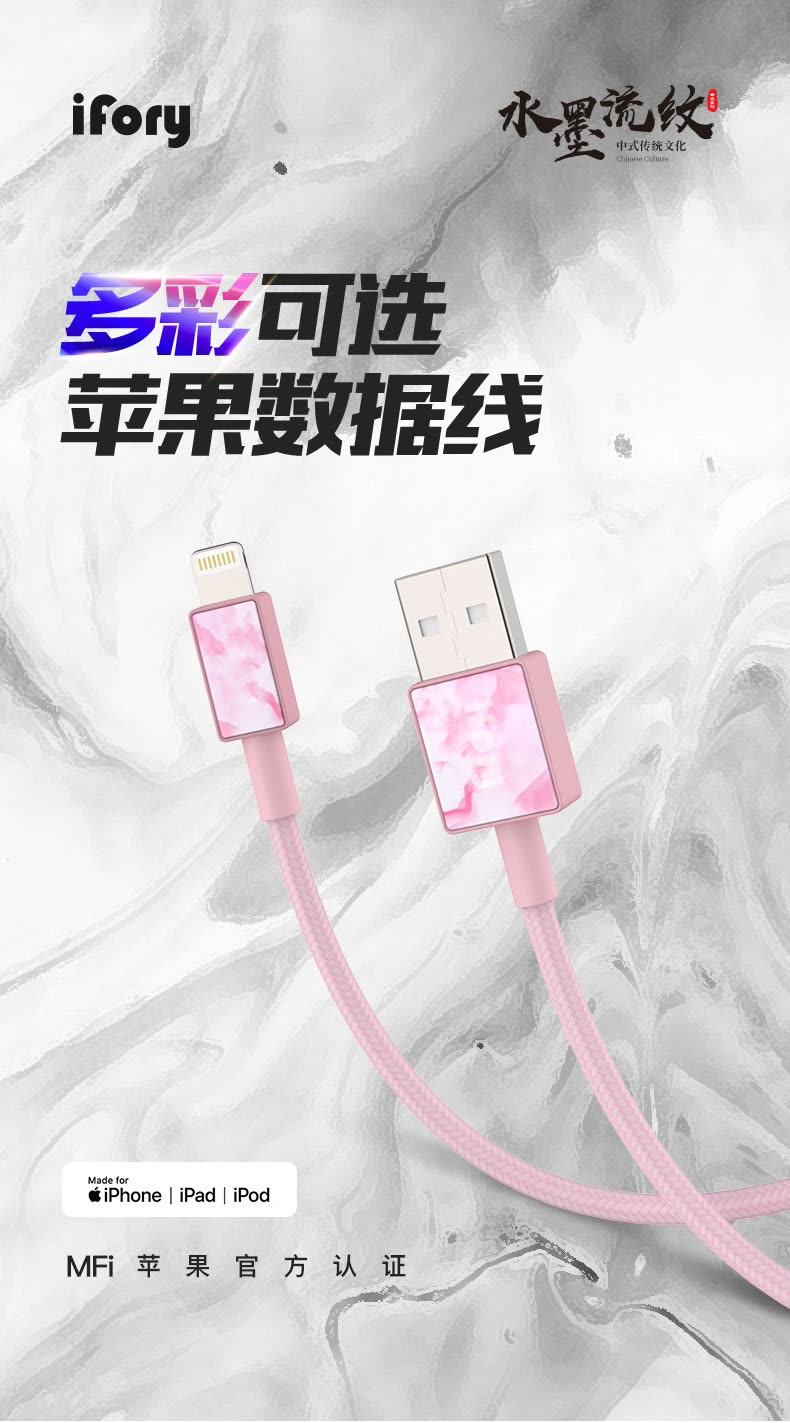 除了品质大幅领先业界外,iFory的产品在外观设计、个性化体验等其他方面也独树一帜。独创的水墨流纹设计,一改市面上其他品牌数据线非黑即白的现状,给予消费者丰富的色彩选择以及独一无二的个性化定制体验,超越你对数据线的想象。套用一句流行广告语“不是所有的数据线都叫iFory”。拥有MFi认证的iFory数据线产品,每一件这世上都仅此一件,这样的产品或许已经超越科技配件的要求,而更像一件珍稀的艺术品。