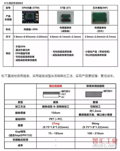 直线检测用GMR传感器产品主要有OPA内置(STM)、ST型(ST)和芯片型(MF),具体产品阵容及特征如下: