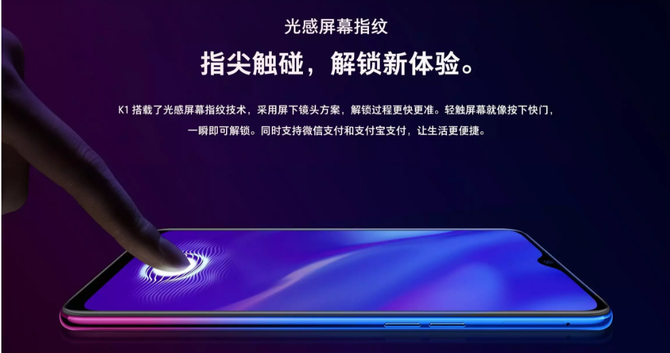 尤其是在屏幕方面,K1不仅具备旗舰机都未必标配的超前的光感屏幕指纹技术,可以轻触屏幕轻松解锁,支持微信和支付宝等支付,同时与同等价位手机相比,采用了成本更高的三星AMOLED屏幕,使色彩显示效果甚至可以接近大部分旗舰机水平!尽管定位于千元档,但是K1采用与R17系列同样精彩的水滴屏设计,也带来了91%的超高屏占比,追剧、玩游戏都可以享受到极致的视觉体验,可以说是非常超值的。
