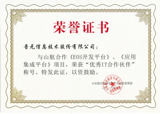 此次荣誉的获得,是山东航空对普元技术实力和服务品质的高度肯定。未来,普元将继续用优质的技术产品及服务支撑航空企业业务创新,与客户精诚合作、精益求精、再创佳绩!