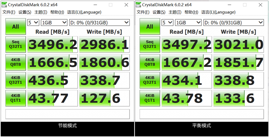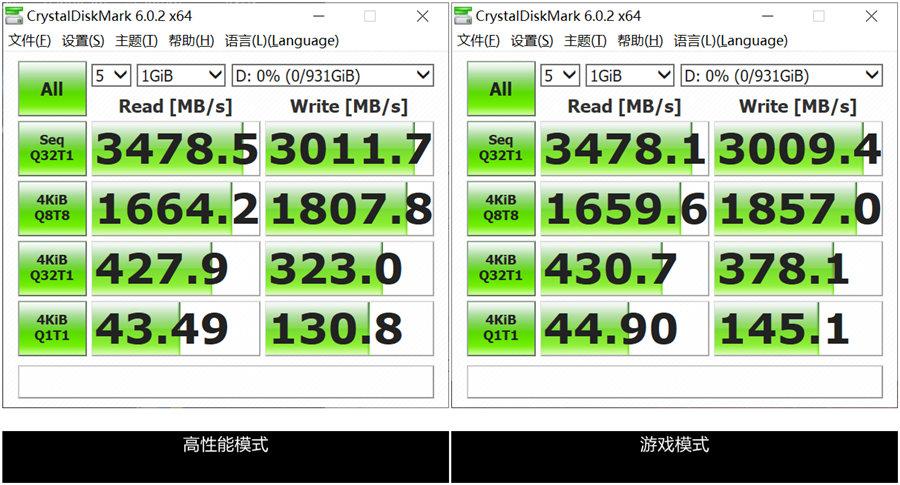 在CrystalDiskMark的跑分中我们可以发现, windows系统不同电源模式调节后,4K随机写入是开启游戏模式变化最大的项目。游戏模式通过关闭节能,禁止SSD休眠,从而降低延迟,提高了4K随机写入性能。相较系统高性能模式下提升了约10.9%。