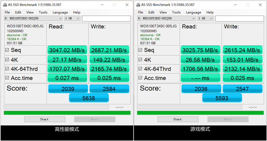 在AS SSD Benchmark的跑分中,结果与CrystalDiskMark很相似,依旧是提升了4K写入性能,相较系统高性能模式提升幅度约为2.6%。