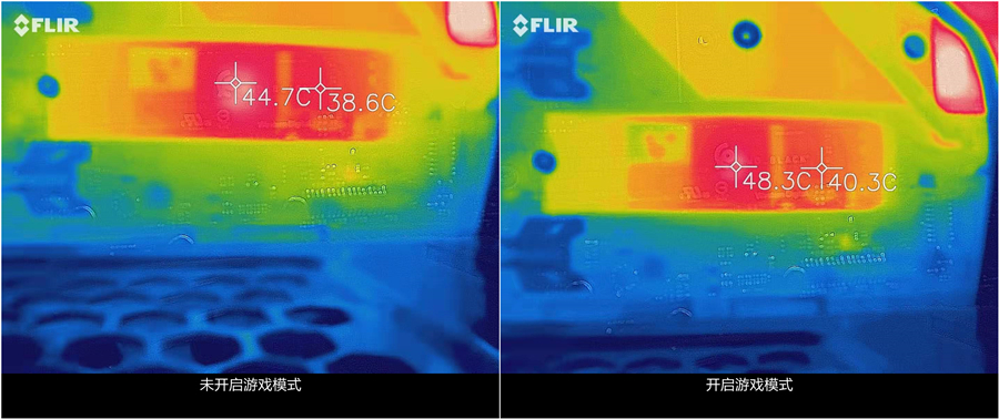 可以看见,SN750在未开启游戏模式状态下待机最高温度在44.5℃左右,而在开启了游戏模式后,待机最高温度在48.5℃左右。两种模式的待机温度差约为4摄氏度。