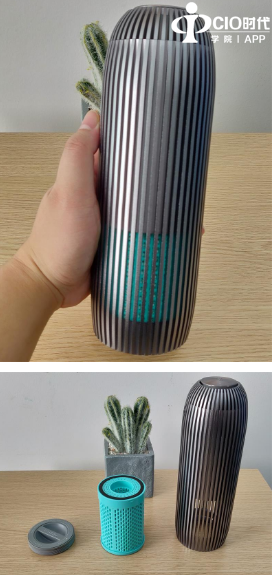 净化器主体分位三个部分外壳、滤芯和风扇,外壳采用的铝合金材质,全金属机身,看起来很有质感也很安全,镂空的设计加大了进风面积,也大大减轻了净化器整体的重量。滤芯可以说是一个放滤芯材质的容器,里面的白色小球遇到甲醛和细菌病毒之后便会产生化学反应将甲醛和病毒分解成水和二氧化碳。