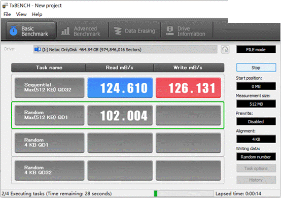 TxBENCH测试, U905速度达到了124.61MB/s,写入速度为126.131MB/s,测试数据更快。