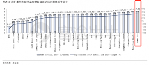 下图是,2017年各车企实际平均燃料消耗量与2020年政策要求标准的差距,长城排在最后位置。
