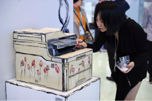 以蒙特里安格子为灵感的Brother展台少不了方块,一个个“Brother方块”在放映Brother历程视频的同时,展示着Brother具有代表性的产品,从平面到立体,给予了观众与众不同的观展感受。更有新锐美女画家万雨尘现场带来的即兴live art show,将原本立体的打印机经过妙手,变为了2D的扁平风。从平面到立体,再到平面,在维度的切换之间展现了Brother产品不同角度的魅力。