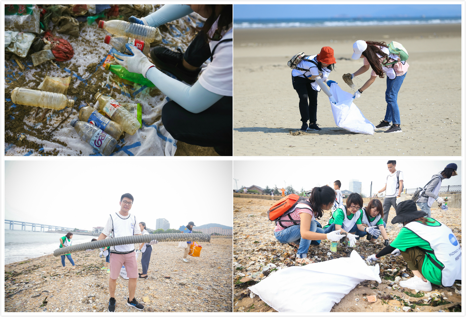 柯尼卡美能达志愿者在大连和福州净滩现场捡拾垃圾